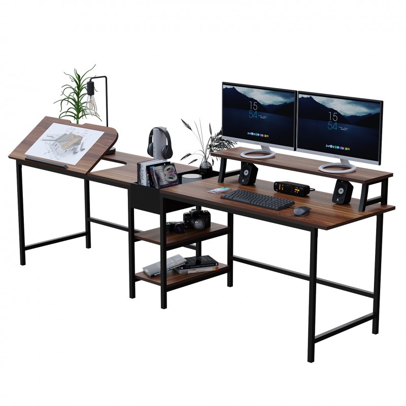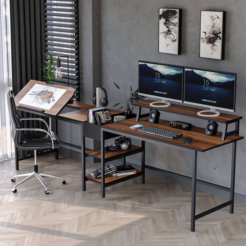 Bu çift bilgisayar masası, ofis, atölye, ev ve apartman daireleri için mükemmel bir çözüm oluşturur. Bilgisayar masası, çalışma masası, çalışma masası, eğitim masası veya oyun masası olarak kullanılabilir. Siyah çerçeveli zarif bir ahşap damar içeren bu masa, modern tarzdaki her türlü mobilyayla zahmetsizce uyum sağlar.
